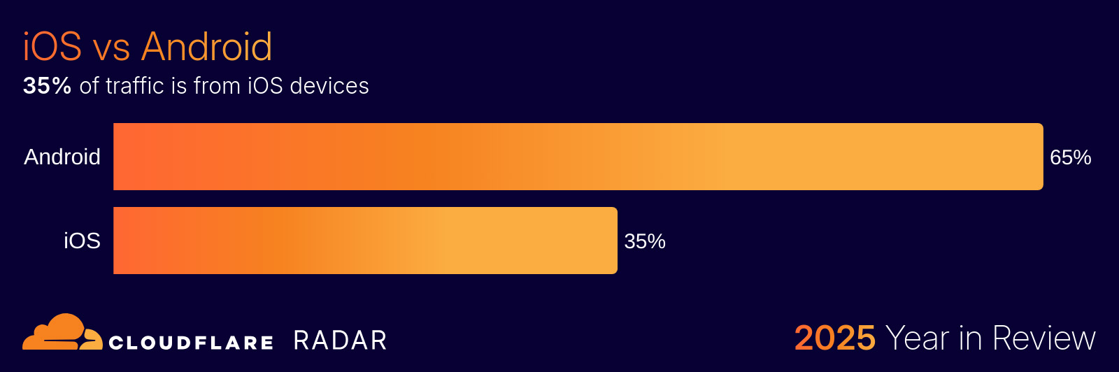 Raporun dikkat çeken bir diğer bölümü ise mobil işletim sistemlerinin internet trafiğindeki payı oldu. Cloudflare verilerine göre, iOS cihazları küresel mobil cihaz trafiğinin %35’ini oluşturdu. Bu oran, geçen yıla göre iki puanlık bir artış anlamına geliyor ve Apple’ın mobil ekosistemdeki gücünü pekiştiriyor.