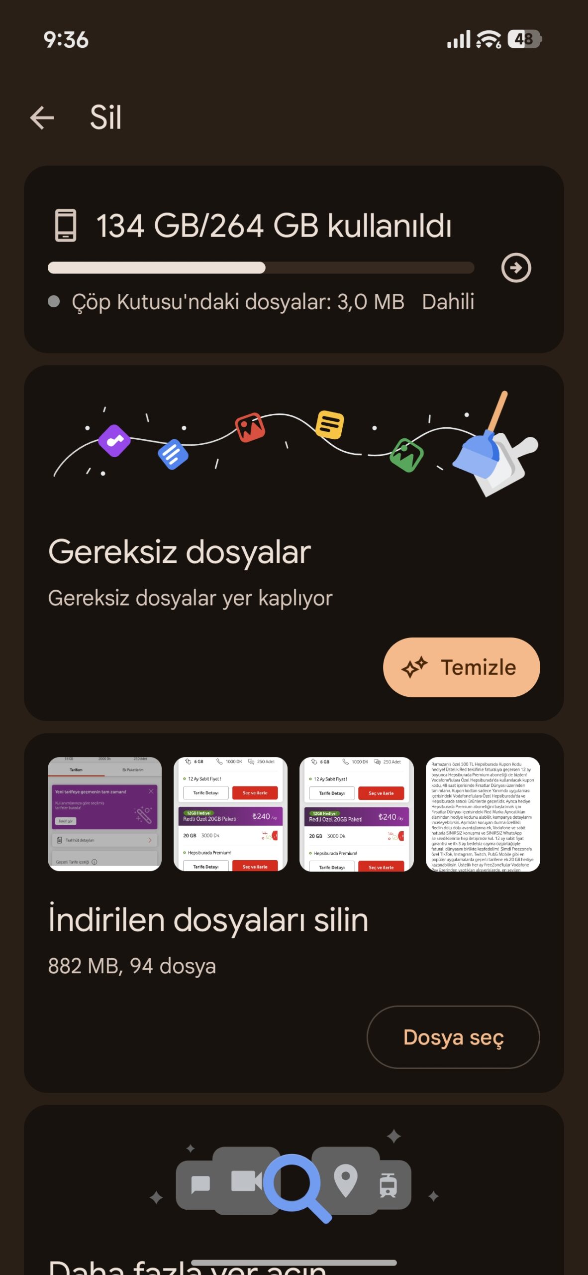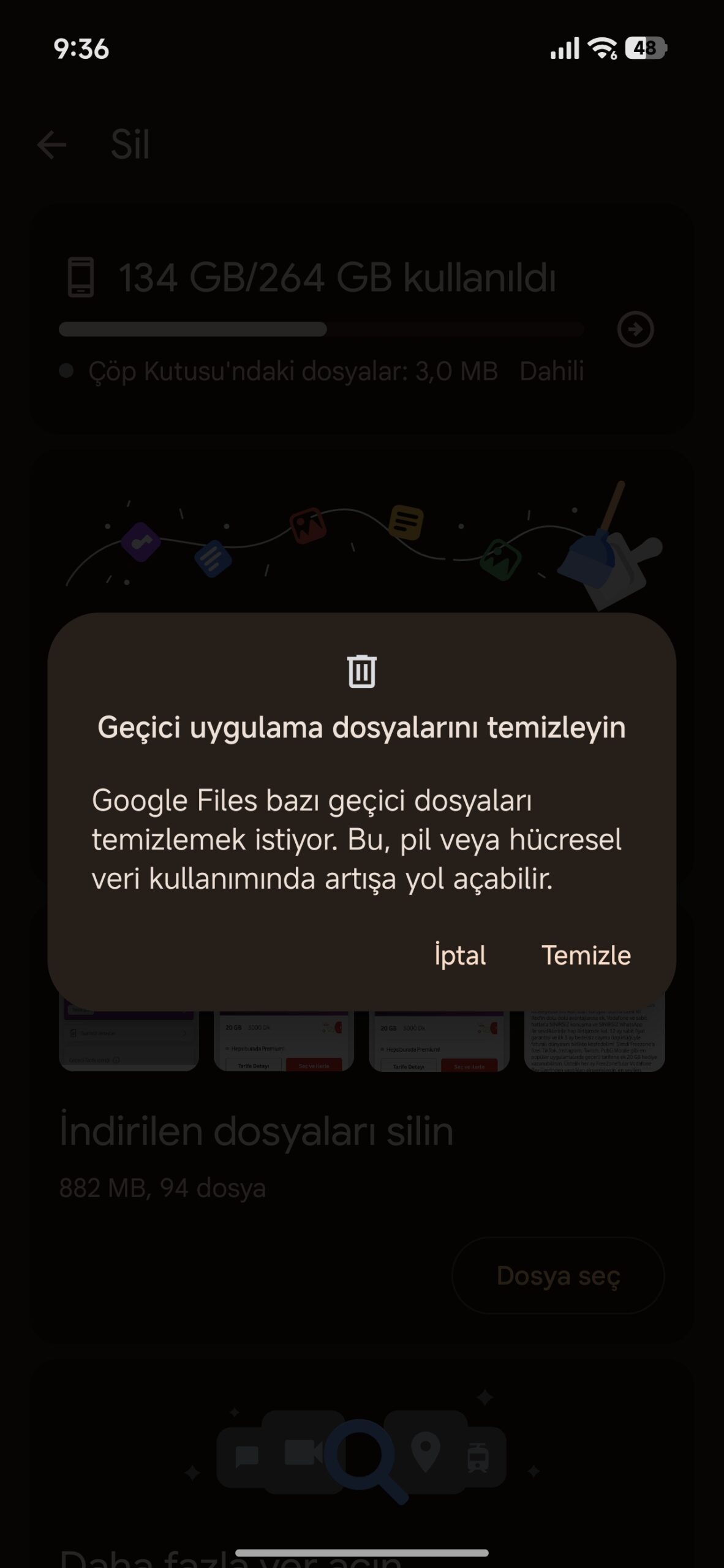 Temizle butonuna bastığınızda, uygulama sizden son bir onay ister ve süreci saniyeler içinde gerçekleştirir. Google Files ayrıyeten yinelenen dosyaları, eski ekran imajlarını, WhatsApp üzere uygulamalardan gelen büyük görüntüleri ve kullanılmayan uygulamaları da tespit eder. “Dosya Seç” diyerek bu kategorilerdeki içerikleri inceleyebilir ve yalnızca silmek istediklerinizi işaretleyebilirsiniz.