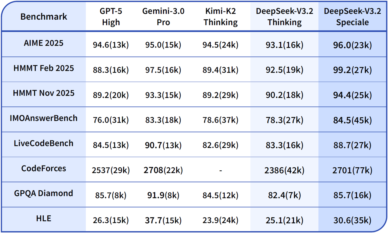Şirketin yayınladığı bilgilere nazaran, V3.2 Speciale sürümü, OpenAI’nin GPT-5 High, Anthropic’in Claude 4.5 Sonnet ve Google’ın Gemini 3.0 Pro gibi endüstri lideri kapalı kaynak modellerini birtakım akıl yürütme testlerinde geride bırakıyor. Bu performans artışına karşın maliyet farkı ise hayli çarpıcı. Örneğin, Gemini 3 API erişimi 1 milyon token başına 4 dolara kadar çıkarken, V3.2 Speciale için bu bedel yalnızca 0.028 dolar düzeyinde kalıyor. Ayrıyeten modelin Memleketler arası Matematik Olimpiyatı ve Memleketler arası Bilişim Olimpiyatı’nda altın düzeyinde performans gösterdiği belirtiliyor.