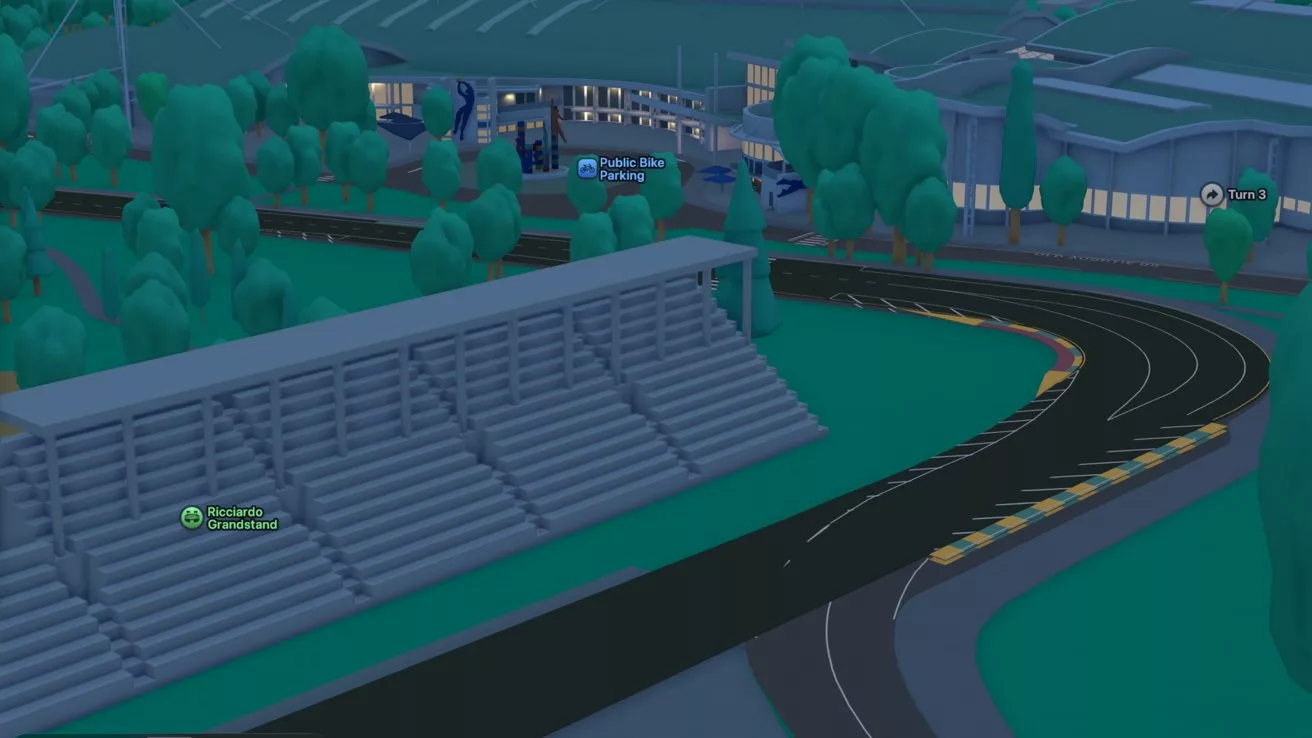Özellikle Melbourne pistine haritada yaklaşıldığında padok alanı, spor ve su sporları merkezi, Lakeside Stadyumu ve pist kenarındaki tribünlerin 3 boyutlu tasarımları oldukça dikkat çekiyor. Bu yapılar, Apple’ın daha önce Özgürlük Heykeli veya Golden Gate Köprüsü gibi dünya çapındaki önemli simge yapılara uyguladığı yüksek kaliteli 3 boyutlu modelleme teknikleriyle aynı şekilde işlenmiş durumda.
