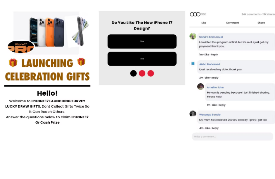 Dolandırıcılar ayrıyeten iştirakçilerin anket doldurmalarını, ferdî bilgilerini (e-posta adresleri, telefon numaraları vb) girmelerini ve teslimat yahut hizmet fiyatı ödemeleri gerektiren, ödül olarak fiyatsız iPhone aygıtları vaat eden uydurma piyangolar düzenliyorlar. Ayrıyeten, “ödüllerini” aldıklarını tez eden kullanıcıların yer aldığı geçersiz bir geri bildirim paneli de sitede yer alıyor.