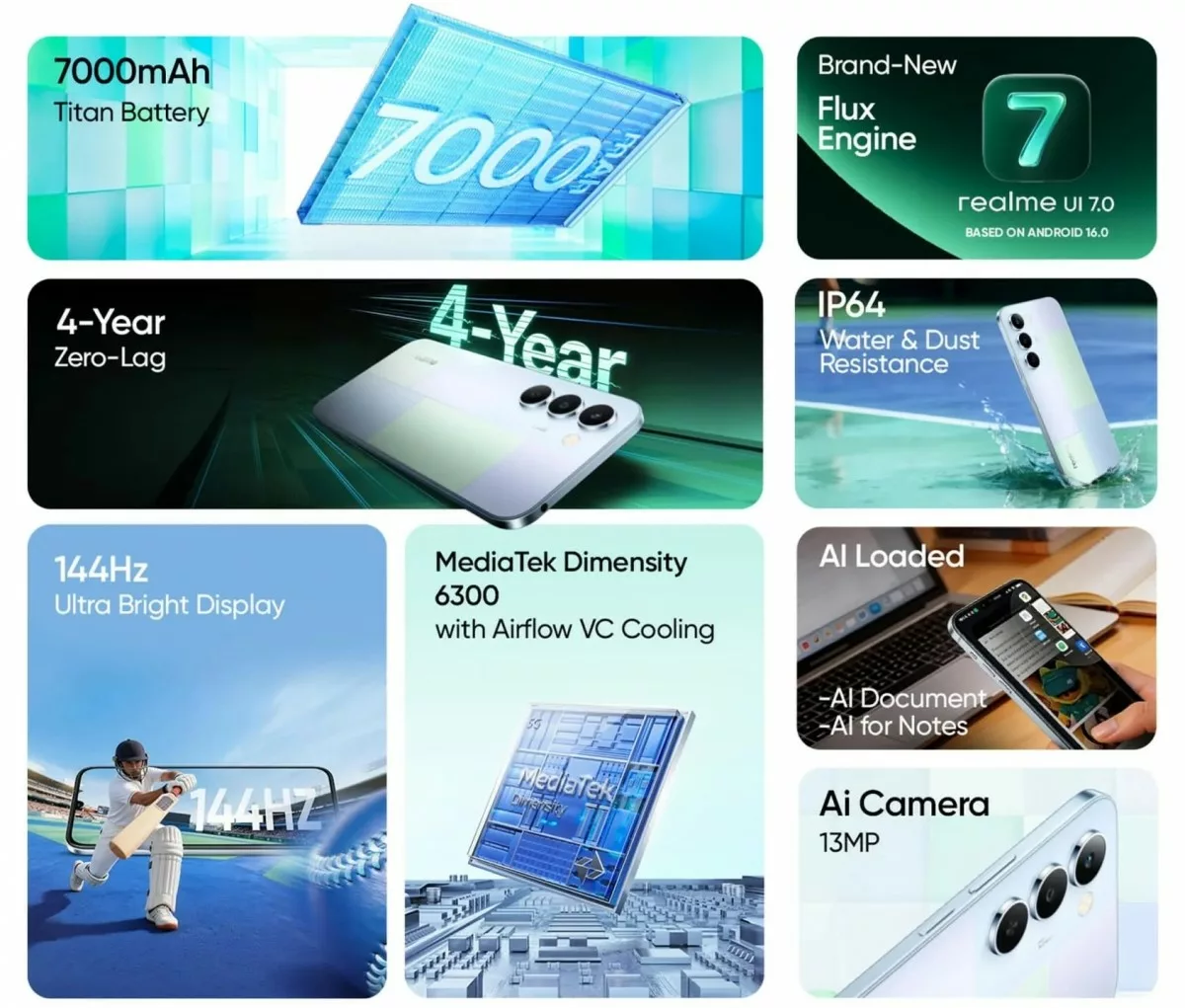 Yazılım ve donanım konusunda da güncel teknolojileri barındıran akıllı telefon, kutusundan Android 16 tabanlı Realme UI 7.0 işletim sistemiyle çıkacak. Şirket, kullanıcılarına 2 yıl işletim sistemi güncellemesi ve 3 yıl güvenlik yaması desteği sunacağının garantisini veriyor. Performansı desteklemek adına cihazda 6 GB’a kadar RAM ve 128 GB dahili depolama alanı bulunacak. Yoğun kullanımlarda ısınmayı önlemek için bu modelde özel bir buhar soğutma odası da yer alıyor.