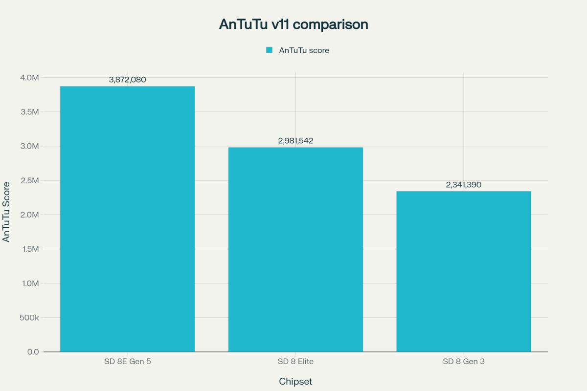 AnTuTu v11 test platformunda, Snapdragon 8 Seçkine Gen 5 toplam 3.872.080 puan aldı. Bu skor, Snapdragon 8 Elite’in 2.981.542 puanından %30 ve Snapdragon 8 Gen 3’ün 2.341.390 puanından %65 daha yüksek.