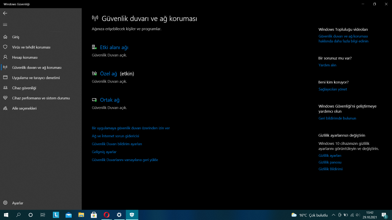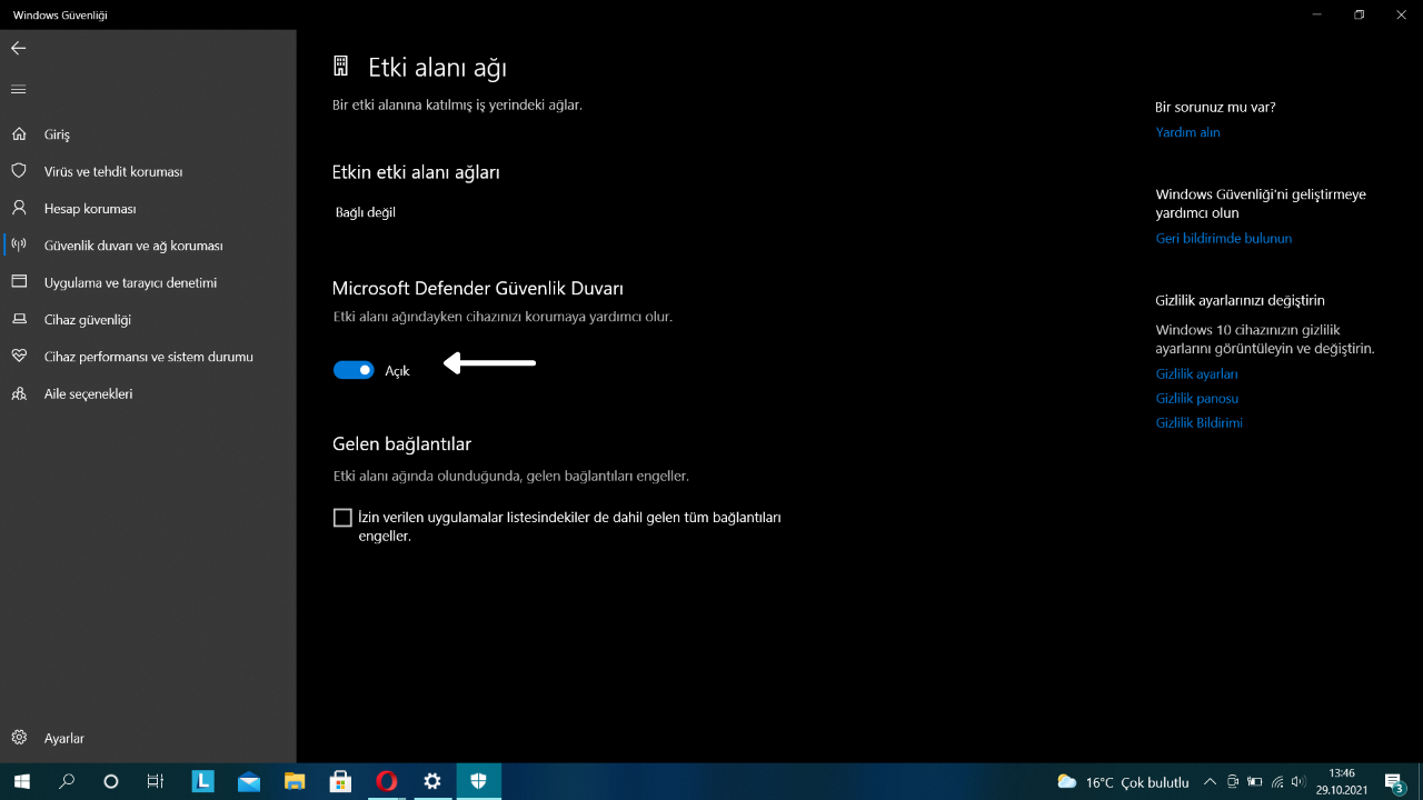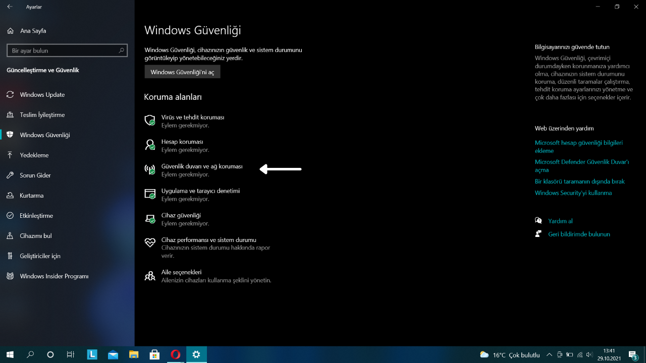 • “Koruma Alanları” listesinde bulunan “Güvenlik duvarı ve ağ koruması”nı seçin.
